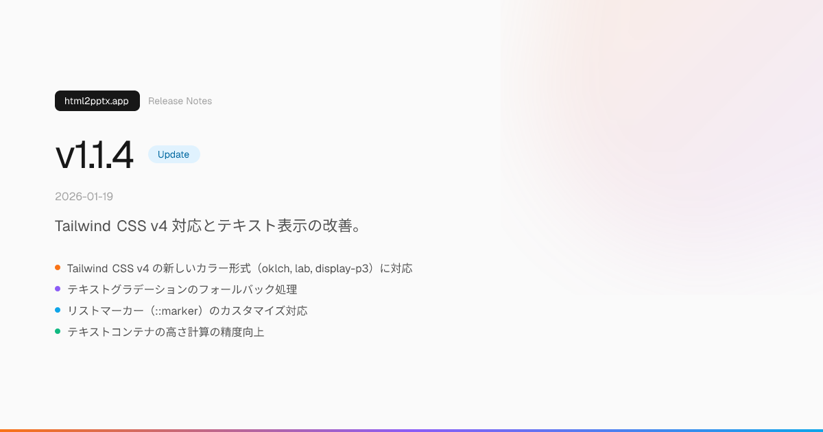 Tailwind CSS v4 対応とテキスト表示の改善。