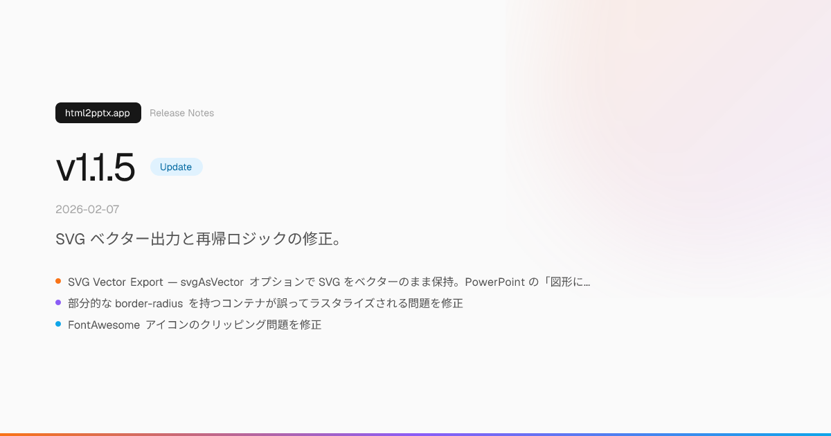 SVG Vector Export — svgAsVector オプションで SVG をベクターのまま保持。PowerPoint の「図形に変換」に対応